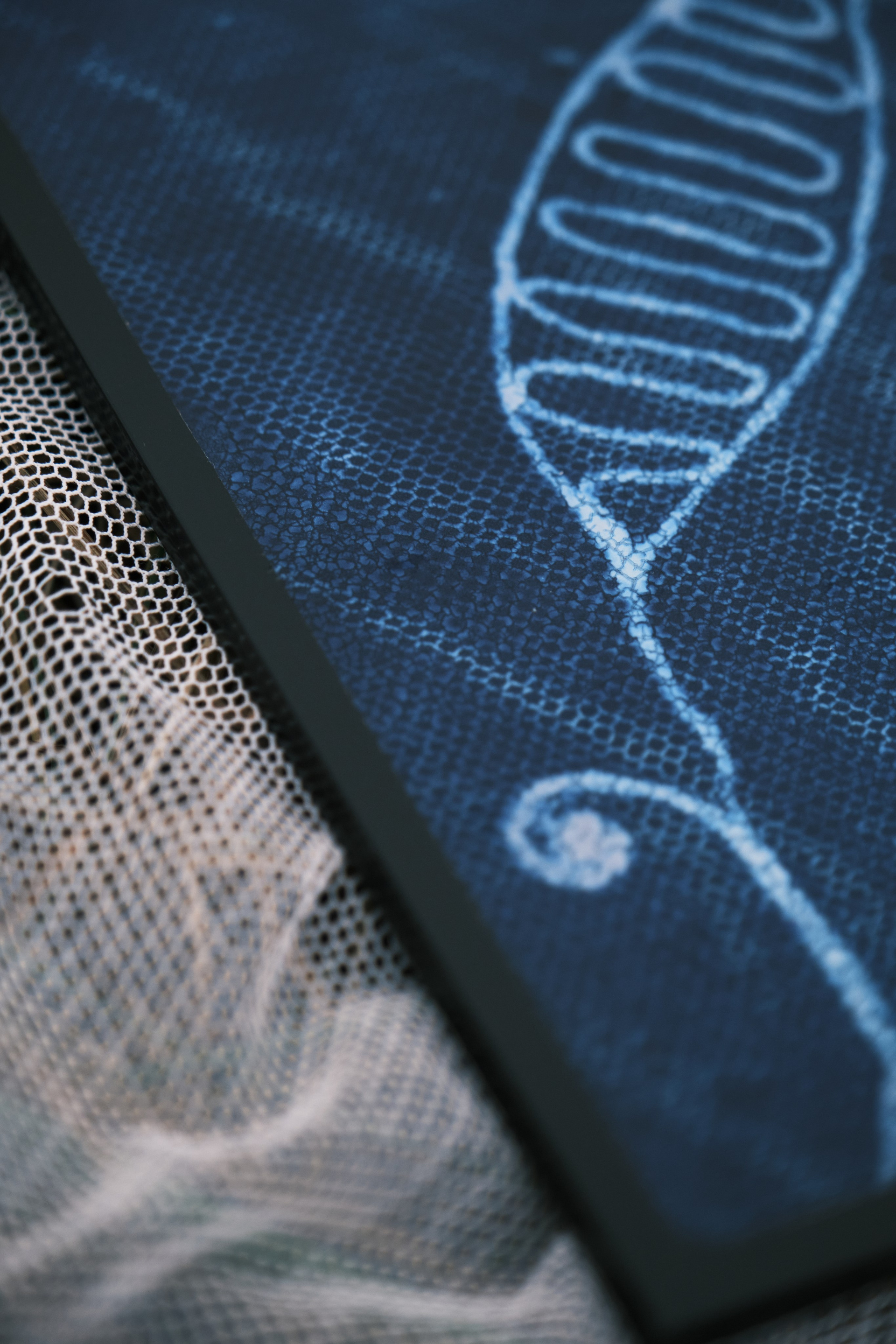 An original print of an image or object on glass, created using cyanotype, an alternative 19th-century photographic technique.